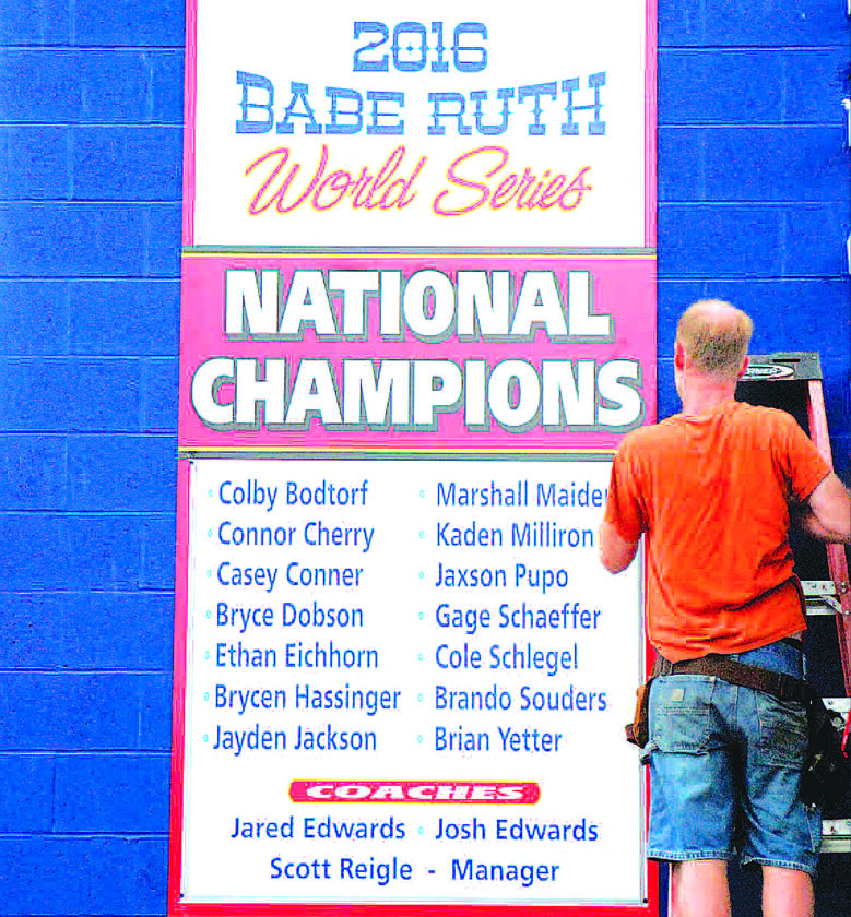 A sign at Armagh Field in Milroy honors Mifflin County’s 2016 13-year-old Babe Ruth Baseball national championship team. The sign was placed at the field in 2018. (Sentinel file photo by BRADLEY KREITZER)