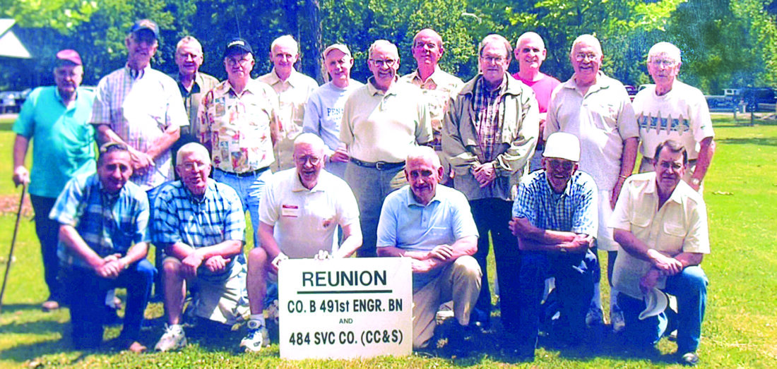 Company B 491st Combat Engineers Battalion 2007 Reunion. From left, front, Dave Stoicheff, Dal Moore, John Stewart, Karl (Ed) Stoicheff, Lee Mackneer and Dave Yingling; back, George Macknair, Dave Stewart, Huey Harshbarger, Ray Wilson, Ron Fleck, Cosmo Mannino, Cecil Knepp, Keith Mackneer, Barry Persing, Fred Stoicheff, Tom Christofos and R. Dutch Deavor.