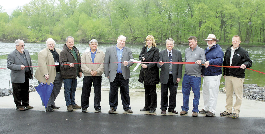 Cutting the ribbon to open the Juniata River Boat Launch Tuesday near McVeytown are, from left, Otis Riden, former Mifflin County commissioner; Steve