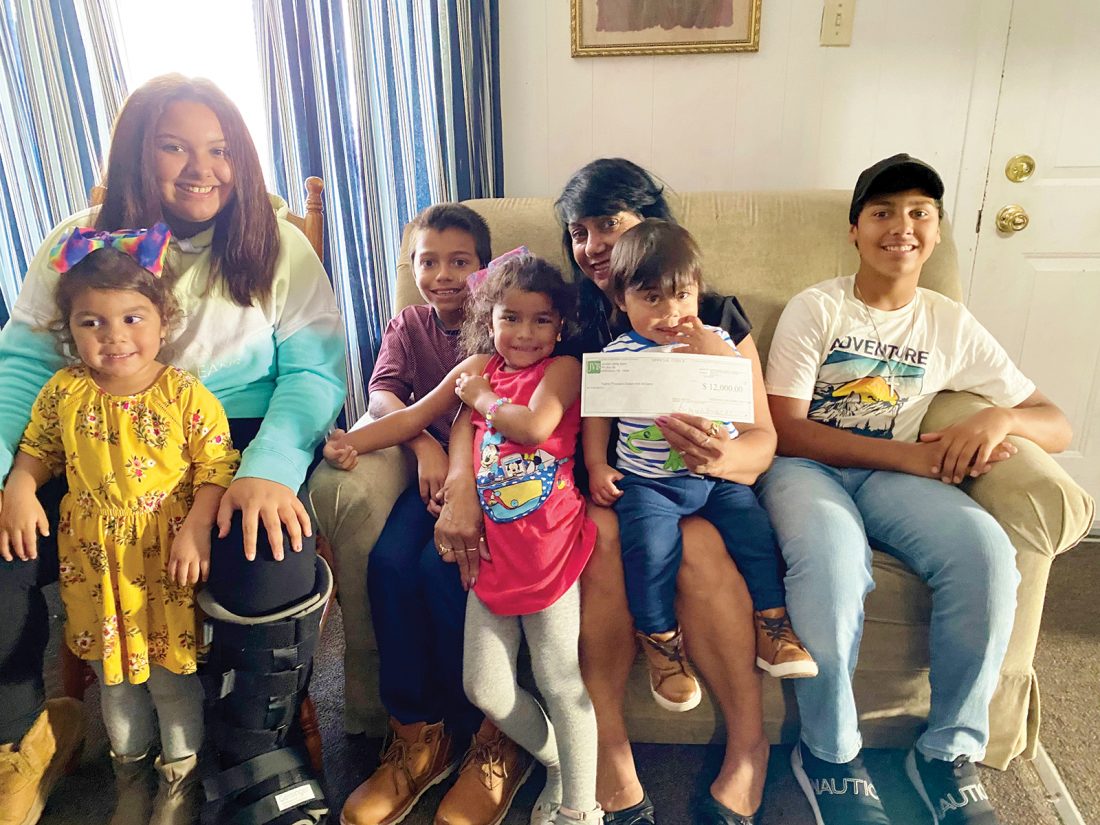 From left to right, the Siennick family includes Lucciana, 3, Graciella, 15, Marquise, 11, Valentina, 4, Vianney, grandmother and caregiver, Ydnic, 1, and Dominique, 12. In this photo, the family is shown at home with a check created from community outreach.