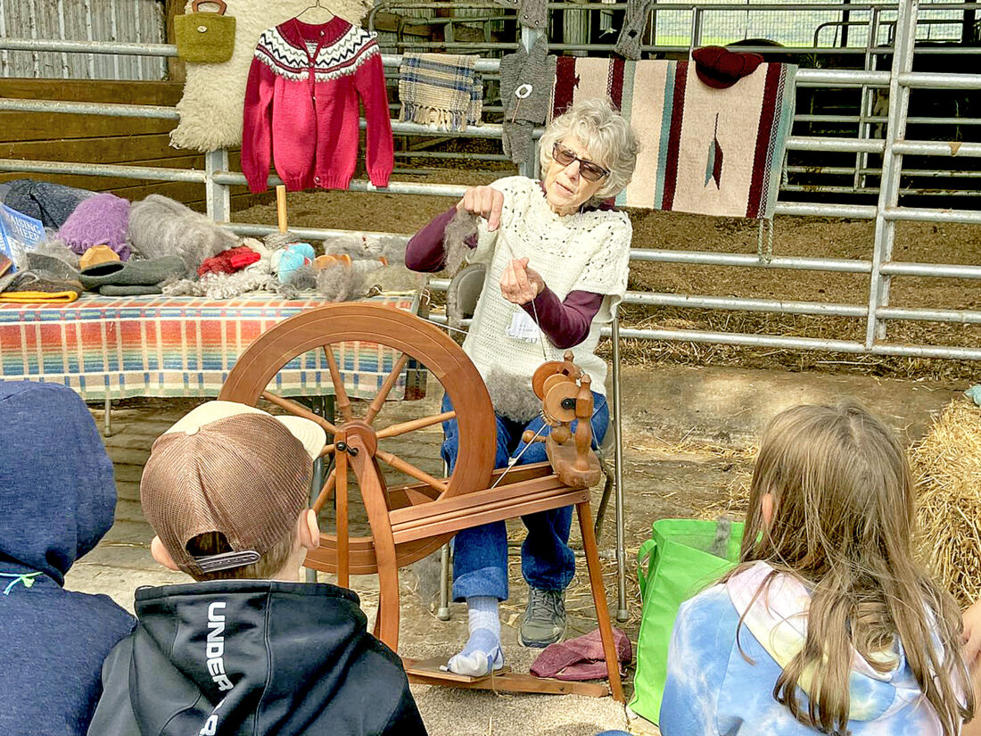 Volunteer Joyce Adamczyk spins wool as students watch.
