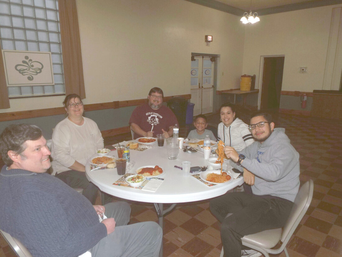From Left: Chris Wagner, Amy Smith, Darren Curry, James Gehman, Lindsay Gehman and Deion Curry chow down some spaghetti at the Spaghetti Dinner over at the Elks Club Friday. The event was to help raise money for new flooring for the club.