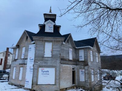 In the meantime, a new roof has been installed on the house, the stone foundation has been repaired and the surrounding yard has been excavated so the pipes could be connected to the city water line and regraded to make certain water flows away from the dwelling.
