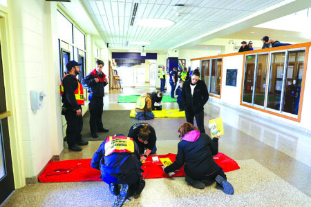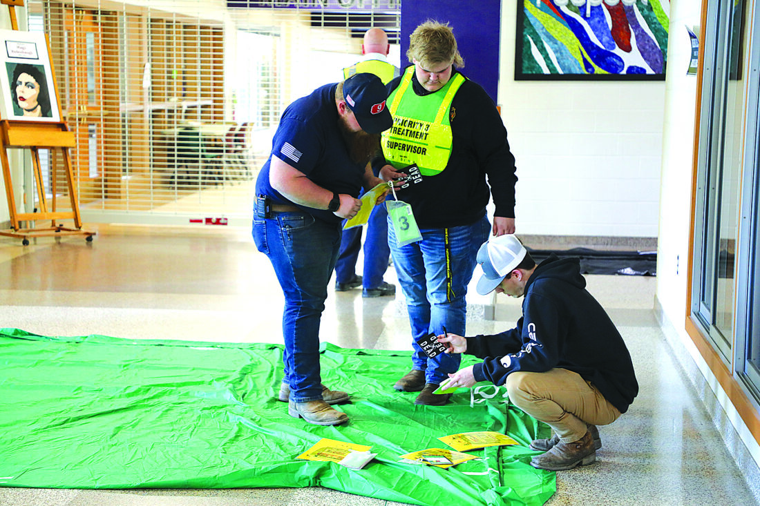 Mifflin County Academy of Science and Technology EMS Student Tyler Evelhoch, City Hook & Ladder Jr Firefighters Hunter Bishop and Dylan Kauffman organize priority of patient injuries for transport on Saturday at the Mifflin Co High School in Highland Park.