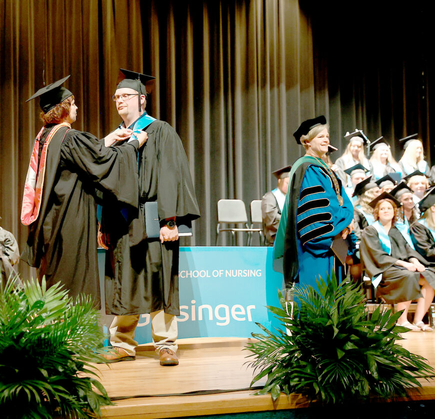 Geisinger School of Nursing graduate Nicholas Zimmerman, of Lewistown, receives a nursing pin Saturday from Beth Finkbiner, director, Geisinger School of Nursing. Julie Byerley, MD, MPH, Geisinger chief academic officer and president of Geisinger College of Health Sciences (standing, right) addressed the graduates during the ceremony. Saturday was a milestone in nurse education at Geisinger School of Nursing, as it presented its first associated degrees. Twenty-nine graduates collected their diplomas at Mifflin County Middle School auditorium.