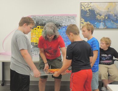 Mifflin County Middle School students Maddox Gentzel (left) as well as Eric Gertzen (middle) and Devin Larson assist artist Linda Billet in lining up the third and final piece of their mosaic art project.