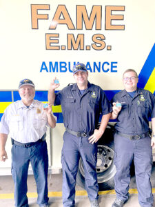 Fame EMS crew members Eric Howell, from left, Matt Evans and Zach Leitzel received Service Excellence Trauma Coin from Geisinger Lewistown Hospital.