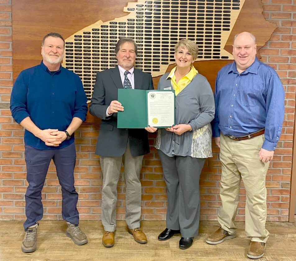 Commissioner Noah Wise, Commissioner Robert Postal, United Way Executive Director Colette Hartzler and Commissioner Kevin Kodish pose for a photo Thursday morning. Commissioners proclaimed January 2025 as United Way month during its regular meeting.