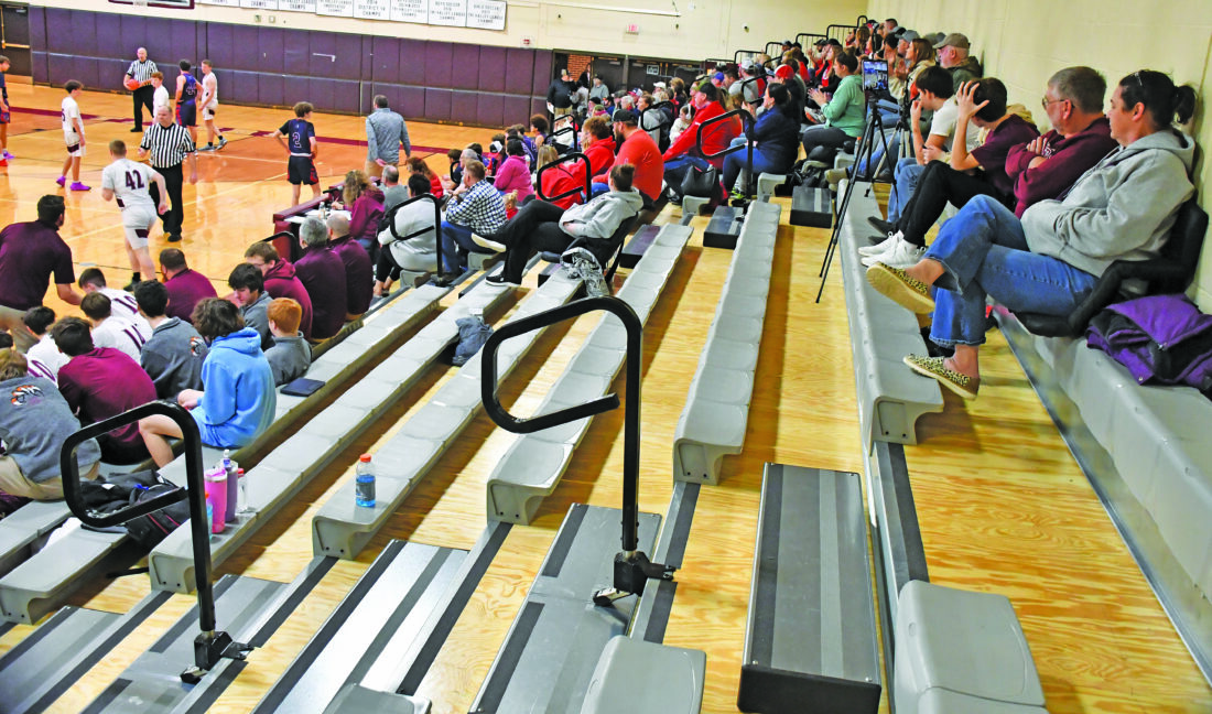 East Juniata High School fans watch a basketball game while sitting in the new bleachers in the high school gymnasium.