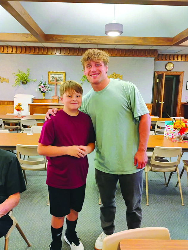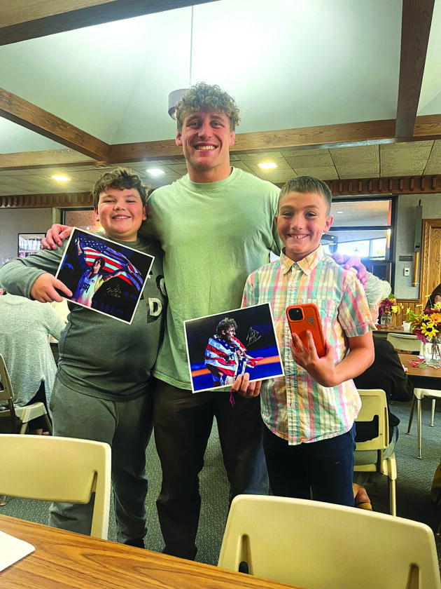 Sentinel photo by MINA PHILLIPS Kyle Treaster (left), and Jackson Drucenmiller (right), show off their autographed items in a photo with Trent Hidlay (middle), during a celebratory church gathering on Sunday.