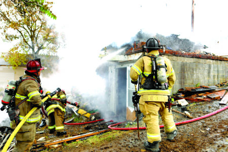 - Sentinel photo by SAM BAUMGARDNER City Hook & Ladder Lt. Brian Mowry sprays down burning debris while City Hook & Ladder Lt. William Baumgardner III moves debris and Junction Fire Co. firefighter Ethan Ross waits to pull debris away at the scene of a fire at 811 E. Walnut St.