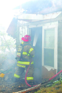- Sentinel photo by SAM BAUMGARDNER City Hook & Ladder Lt. William Baumgardner III sprays down burning debris at the scene of a fire at 811 E. Walnut St., Derry Township.