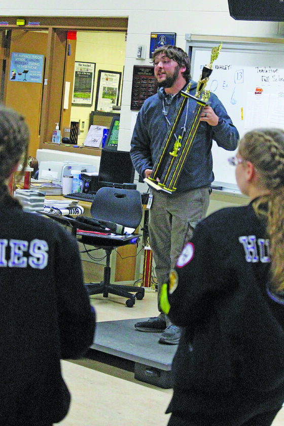Photo courtesy of MIFFLIN COUNTY SCHOOL DISTRICT Mifflin County High School Director of Bands Brandon Kahley talks to the band about their performance.