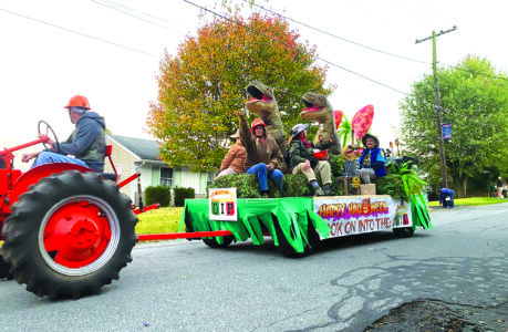 - Sentinel photo by SIERRA BOLGER McVeytown OIP staff don Jurassic Park costumes and toss candy to spectators.