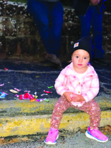 Ellie Rhodes, 1, of McVeytown, sits beside candy she retrieved during the McVeytown Halloween parade in downtown McVeytown.