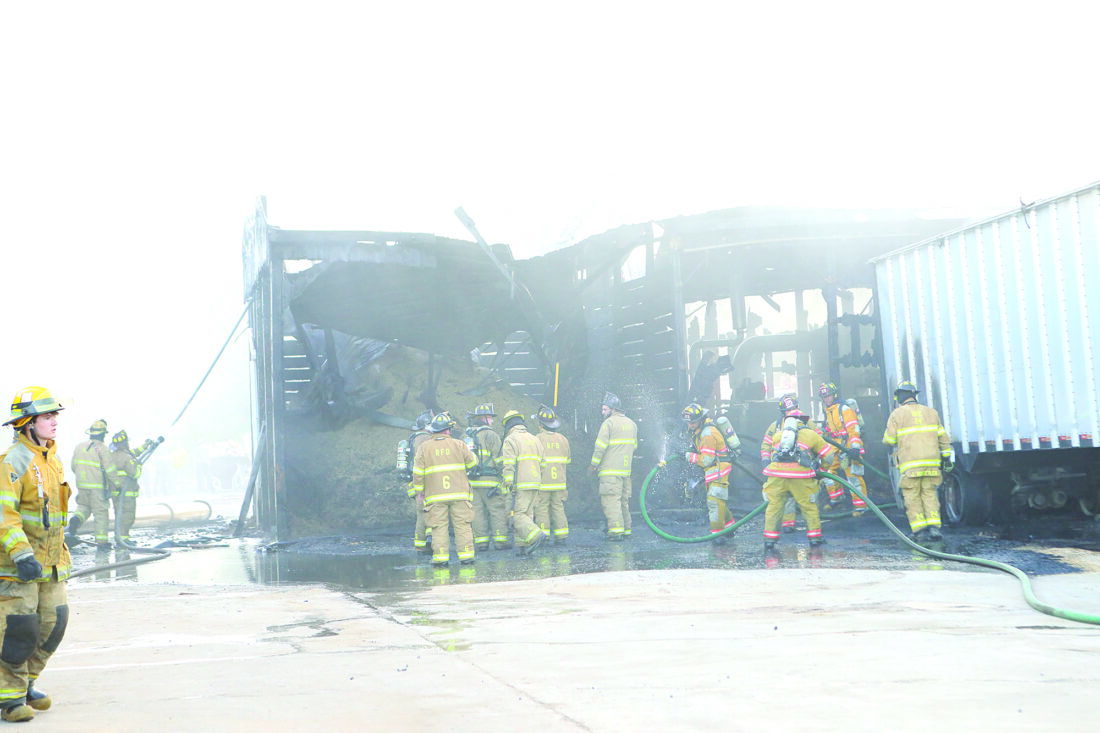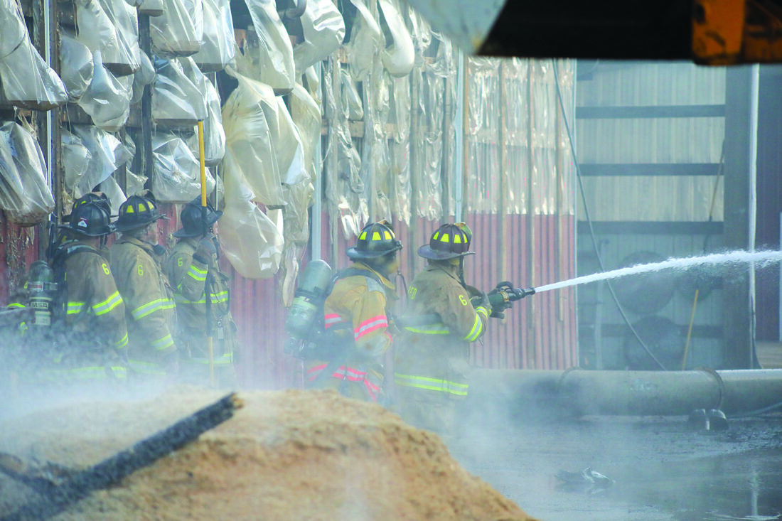 Sentinel photo by SAM BAUMGARDNER Firefighters work to extinguish hotspots and move hoselines out of the way for a front-end loader to move in to separate the sawdust in what remains of the debarking/sawdust storage building at Williams Lumber Co. on West Back Mountain Road in Belleville on Monday evening.