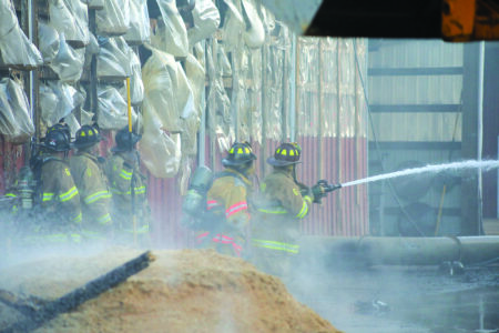 When firefighters arrived on scene, they immediately went to work to stop the spread of the fire that was melting siding on the side of the main sawmill building.