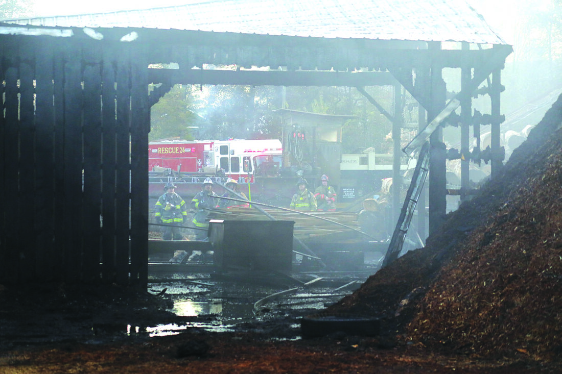 - Sentinel photo by SAM BAUMGARDNER Firefighters evaluate the status of the charred remains of the debarker/sawdust storage building at Williams Lumber Co. on West Back Mountain Road in Belleville Monday evening.