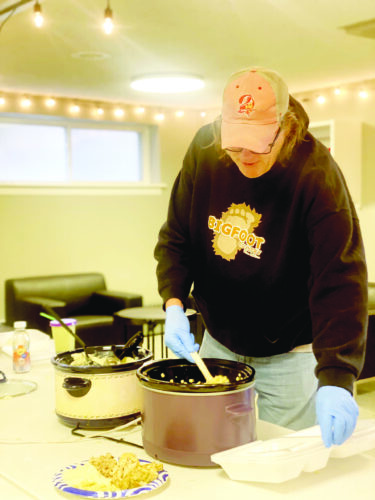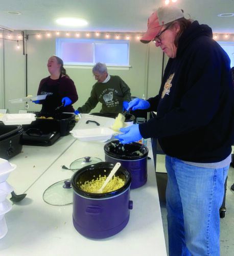 From left, Melissa Stewart and Jane Cunningham and Pete Cato fill to-go plates for Thanksgiving for members of the community Thursday at Calvary Lewistown. The meals were available through a joint effort with New Life Church in Burnham. Staff said the churches served a combined 500 to 600 meals to community members in need on Thursday.