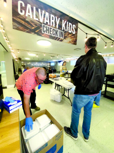 Daniel Yoder packs a box full of meals ready to be served to community members Thursday at Calvary Lewistown.