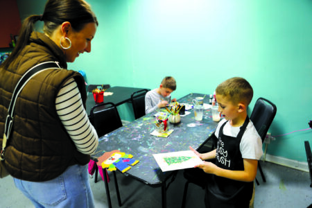 Hudsyn Hall, 8, of Lewistown, shows his mother Britney his Christmas tree painting as Luke Specht, also 8, of Lewistown, paints a nutcracker head at The Busy Brush.