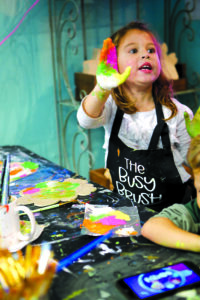 Kaloni Snook, 3, of Milroy, displays her painted hands to her mother while painting a turkey at The Busy Brush during Lewistown First Friday.