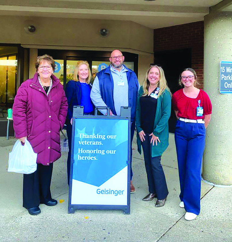 Sentinel photo by SIERRA BOLGER From left, Chief Nurse Executive Janet Tomcavage, Kathy Depra of quality and patient safety, Assistant Vice President of Operations (Western Region) AJ Hartsock, Manager of Volunteer Services Kylle White, and Gianna Baresse, administrative fellow, all of Geisinger-Lewistown Hospital, operated the drive-thru veteran appreciation dinner Thursday afternoon.