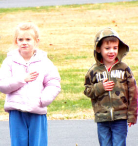 Tripp Peachey (left) and Eli DeArmitt show their respect to the flags.