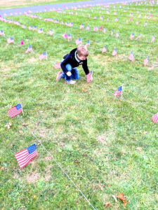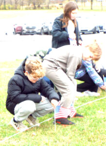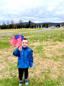 Aidan Ayers plants his flag at the Field of Flags ceremony held at Indian Valley Elementary Center Monday afternoon.