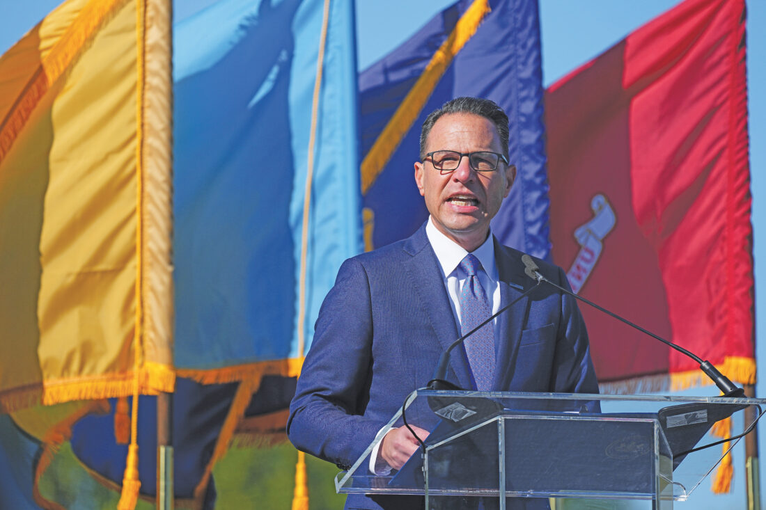 Pennsylvania Gov. Josh Shapiro speaks during the 250th anniversary of the founding of the U.S. Navy and Marine Corps, along the Delaware River, Thursday, Oct. 9, 2025, in Philadelphia. (AP Photo/Matt Rourke)