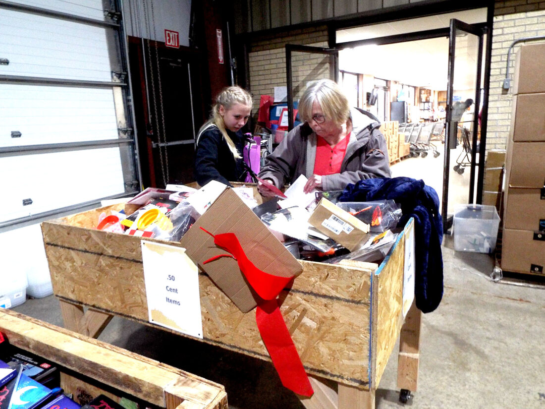 Jaylene Fultz and Kathy Fisher sift through bins at Lewistown Liquidators Friday in an attempt to find some deals for Black Friday.