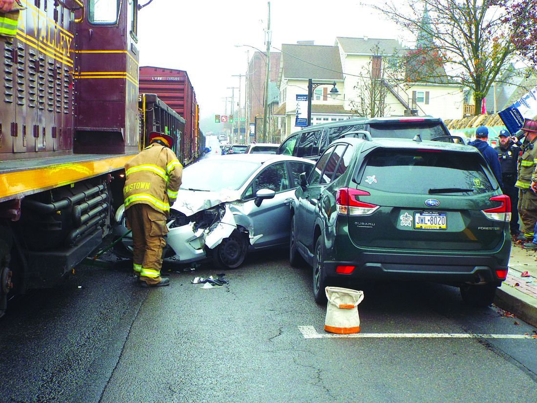 Crews respond to a train-vehicle crash on Water Street in Lewistown Wednesday morning. (Sentinel photo by TOM LAUB)
