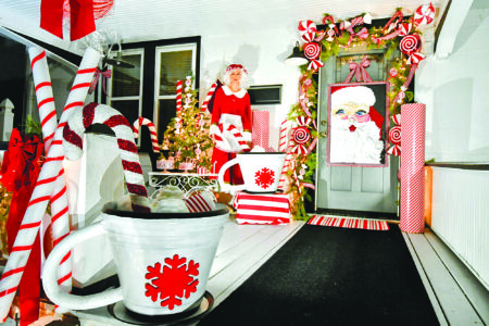 4. Lisa Knudson: 112 N. Walnut St. A four foot Santa face is painted on a black canvas covering the front door, while oversized mugs of hot cocoa made of painted garden pots, peppermint sticks made of pool noodles and garland filled with cellophane-wrapped paper lanterns decorate the porch.