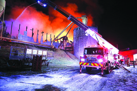 Firefighters use an elevated master stream from the Mifflintown Hose Co. Tower truck at a fire at Treen Pallet Co. near Thompsontown.