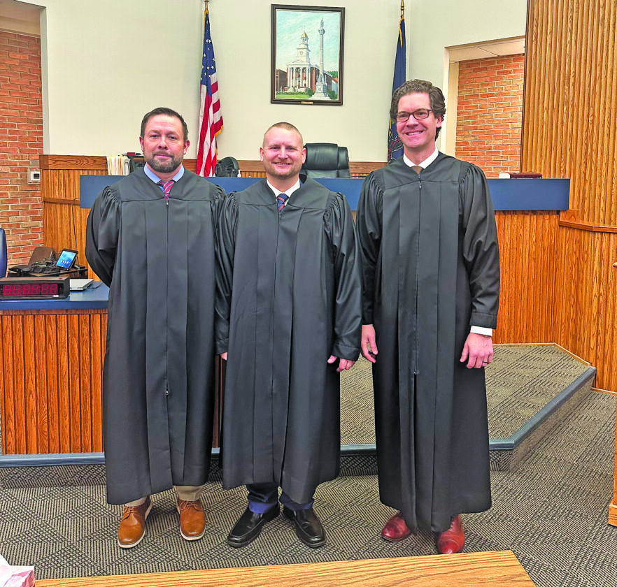 Newly-elected Magisterial District Judge Eric S. Ettinger, center, is flanked by President Judge Aaron L. Gingrich, left, and Judge Jonathan W. Reed after being sworn in. Ettinger will serve District Court 58-3-02.