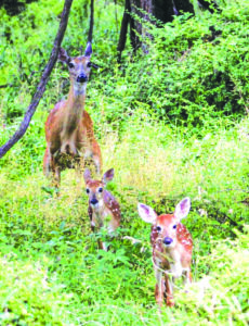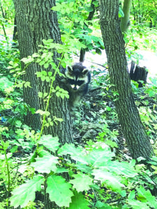 Deer and a raccoon prowl area woods prior to cold winter temperatures.