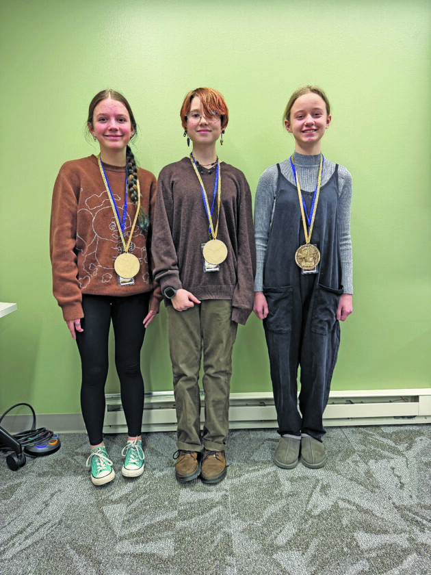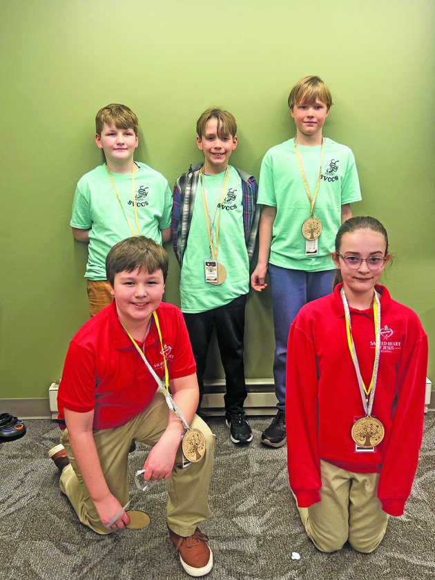 The Three Pink Ponies from Sacred Heart of Jesus School in Lewistown secured second place, with team members David Anderson, Amelia Thierwechter and Adelene Shank working together with determination and heart.