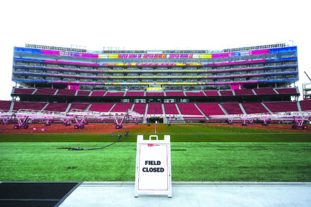 Signs for Super Bowl LX are displayed on the SAP Tower on Jan. 20 at Levi’s Stadium in Santa Clara, Calif.