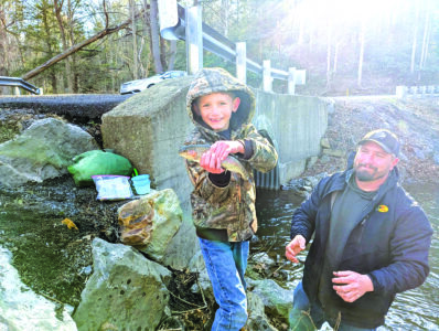 Cole Nearhood, of Mifflintown, and his son, Mathis, age 7, are all smiles after landing a trout.