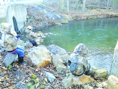 Mathis Nearhood, age 7, and his younger brother, Madden, age 4, fish with cousin Brock Nearhood, age 12, on Mentored Youth Trout Day on Saturday. The 2026 youth trout day was March 28, offering youth anglers a special opportunity to fish with adult mentors before the regular trout season opened.