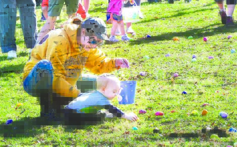 11-month-old Parker Snyder reaches for an egg with help from his mother Amanda Snyder, both of Mifflintown during the Sons of the American Legion Post 298 Easter egg hunt held at the Mifflintown playground.