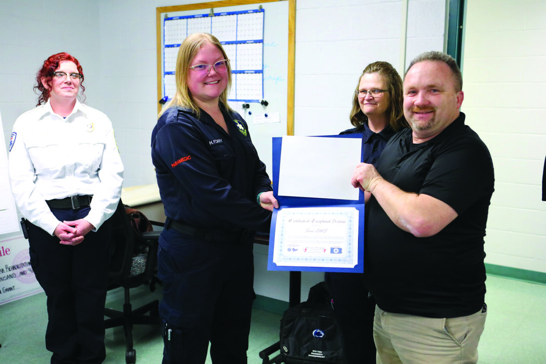FAME EMS Paramedic Harley Bilger receives a unit citation for FAME EMS from Seven Mountains EMS Council Director Harold Mast Monday afternoon at the Derry Township Municipal Building.