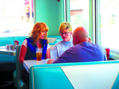 Gubernatorial candidate Republican Stacy Garrity chats with Paul Lesher during a campaign stop at Bing’s Diner Wednesday afternoon.