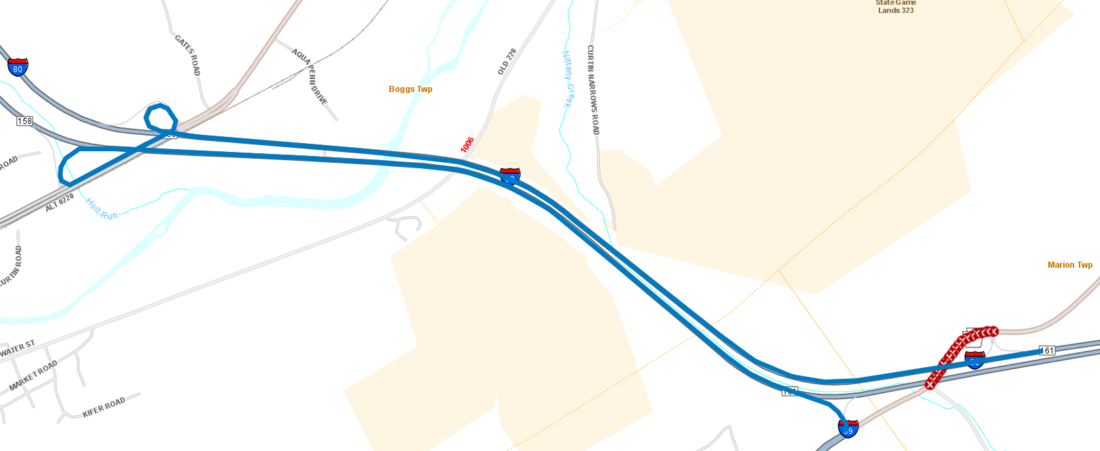 Under the current traffic pattern, motorists traveling on I-80 westbound toward I-99 southbound will not be permitted to use Exit 161 (Bellefonte). Instead, traffic will continue to Exit 158 (Milesburg), where drivers will exit, re-enter I-80 eastbound, and then access I-99 southbound via the Bellefonte exit.