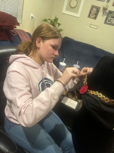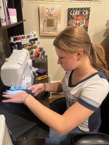 Carter’s sewing skills trace back to childhood. She learned how to sew at age seven from her great-grandmother, Robetta Sipe, who worked as a seamstress. Those early lessons laid the foundation for a skill she continues to use today.
