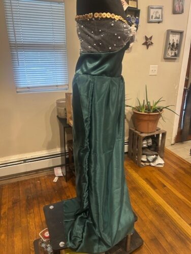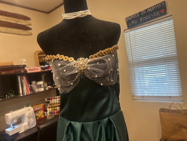 The result is a gown featuring rich green satin accented with gold and black, a deliberate color palette Carter selected to stand out while still feeling elegant. She purchased her fabrics from Hobby Lobby in Burnham, choosing materials she had long hoped to work with.
