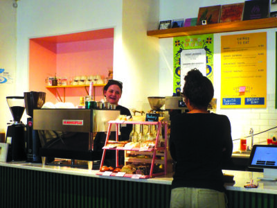 Kathryn Wagner, a Reedsville resident and East End Coffee Co. employee, makes coffee and welcomes crafter Brittany Royer, of Lewistown, to the Friday evening ‘Night of Crafting’ event hosted by Habitat for Humanity.