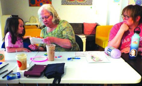Judy Semon of Lewistown demonstrates how to embroider while her granddaughter, Scarlett Schomaker of Burnham, listens intently and her daughter, Kaela Schomaker, looks on.