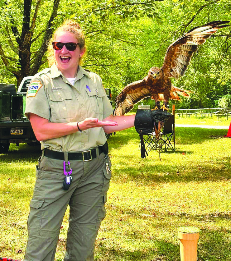 Environmental Education Specialist Kylie Orndorf, of the Reeds Gap State Park Complex, holds a bird mount during a presentation.