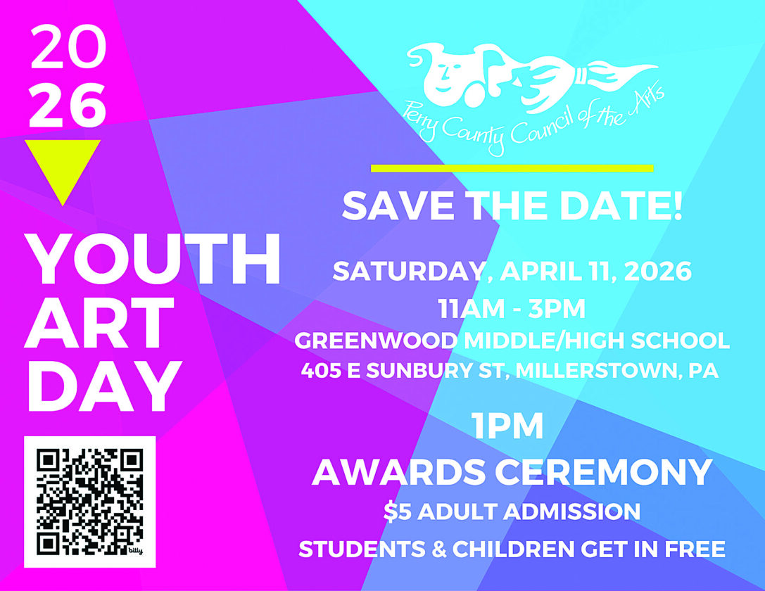MILLERSTOWN — Perry County Council of the Arts will host its annual Youth Art Day at Greenwood Middle/High School, 405 E. Sunbury St, Millerstown, on Saturday, April 11 from 11 a.m. to 3 p.m. Youth Art Day is a showcase of visual art and literary talent from students or residents of Perry County in kindergarten through 12th grade. The event features a large student art exhibition, readings of award-winning literature, kids’ activities, artist demonstrations, a community mural painting activity and more. Event admission is $5 for adults, students and children get in free.